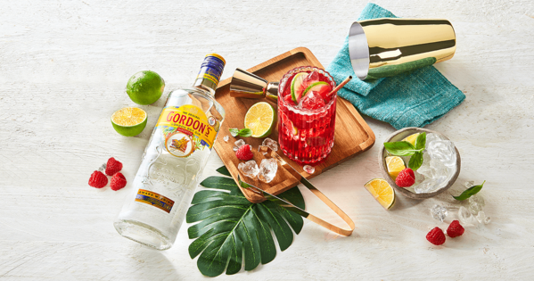 Ein Highball-Glas mit viel Eis befüllen, Gordon‘s Gin und Cranberrysaft darübergeben und mit Ginger Ale