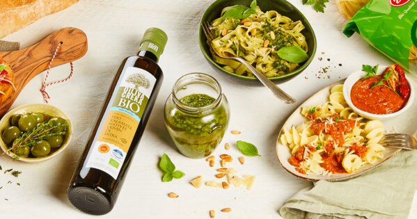 Für das Pesto den Rucola waschen und trocken schütteln. Den Knoblauch schälen und mit den anderen Zutaten grob pürieren.