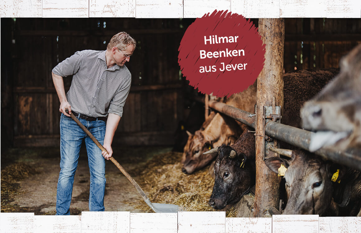 Der 150 Jahre alte Hof von Hilmar Beenken liegt in Jever und ist umgeben von Weideflächen. „Das ist historisch bedingt“, erklärt der Landwirt. 75 Hektar Land und mittendrin der Hof von Familie Beenken. Auf diesem hält der Landwirt 25 Rinder in der Haltungsstufe 4. Die HofWerte-Rinder haben ständigen Zugang zu Außenbereichen und frischer Luft. Etwa 60 Hektar steht den Tieren als Grünland und Weidefläche zur Verfügung. Auf den restlichen 15 Hektar wird das Futter für die Tiere angepflanzt. Denn das kommt ausschließlich vom eigenen Hof. Hilmar Beenken hat den Betrieb in 4. Generation von seinen Eltern nach seiner Ausbildung zum Landwirtschaftsmeister übernommen. Seine Eltern helfen auf dem Familienbetrieb auch heute noch regelmäßig mit. Darüber hinaus unterstützen zusätzlich noch ein paar Jungs aus der Nachbarschaft den Landwirt bei der täglichen Arbeit. „Die kamen früher als Kinder neugierig zu mir auf den Hof und wollten unbedingt mal Trecker fahren“, sagt Beenken und lacht. Heute kommen sie immer noch und packen bei der Arbeit auf dem Hof mit an.