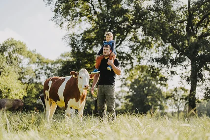 Der Hof ist ein klassischer Familienbetrieb. Jeder packt mit an. Krumlands Eltern, seine Frau und Kinder aber auch seine beiden Brüder sind neben ihren Berufen sehr aktiv bei der Hofarbeit dabei. Zusammen bewirtschaften sie 85 Hektar. 38 Hektar davon werden als Ackerland für Getreide und Mais genutzt. So können die Rinder mit hofeigenem Futter gefüttert werden. Das Schöne am Landwirtsein? „Die Flexibilität. Dass ich mir die Arbeit selbst einteilen kann und immer draußen arbeiten kann“, antwortet Krummland.