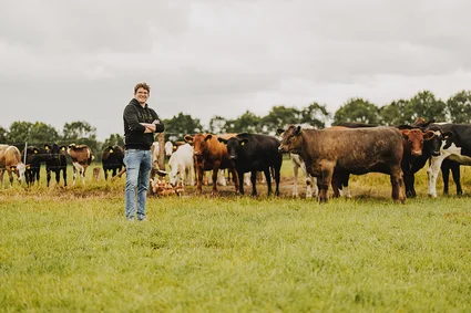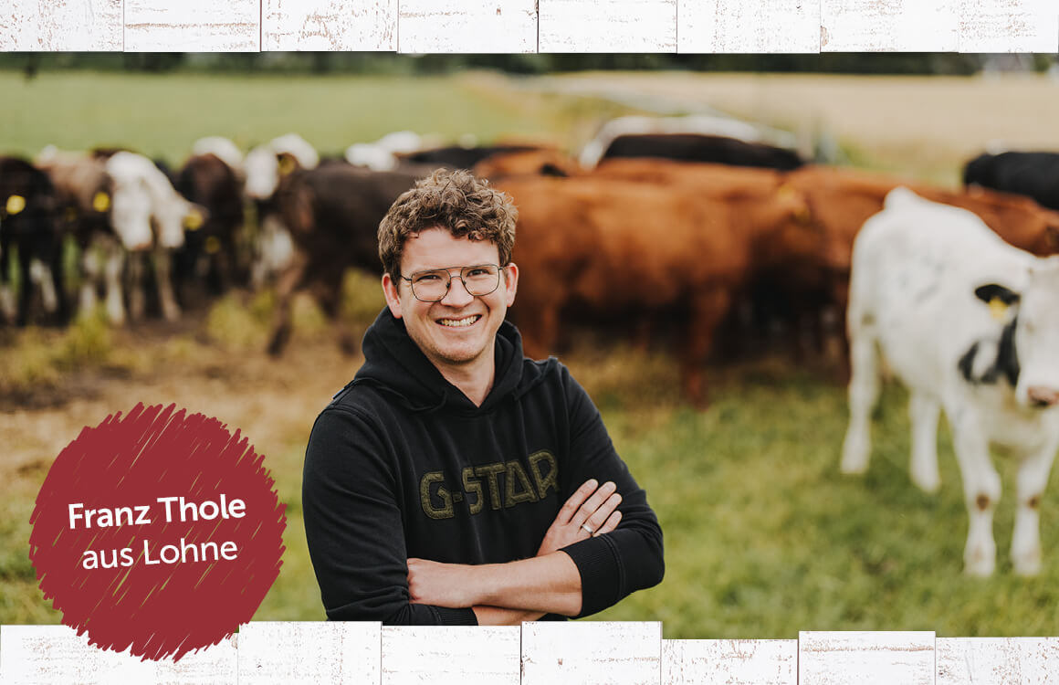Nachhaltigkeit und bewusster Fleischkonsum: Diese Themen treiben Franz Thole an. Der Landwirt aus Lohne hält 40 Rinder im Nebenerwerb in Haltungsstufe 4. Schon in seiner Kindheit hat er jede freie Minute auf dem Familienbetrieb verbracht. Die Hofstelle wurde im Jahr 1964 von seinem Großvater erbaut. Seit 2017 führt Thole den Betrieb in 3. Generation. Dafür hat der studierte Maschinenbauingenieur die Ställe komplett auf „links“ gedreht. „Wir haben alles umgebaut, modernisiert und die Ställe auch energetisch verbessert“, erzählt der Landwirt. Zwar hielt selbst sein Opa die Rinder über die Sommermonate schon auf der Weide. Aber Franz Thole wollte noch mehr für seine Tiere. Die Rinder sollten auch in den kalten und nassen Wintermonaten Auslauf aus dem Stall haben. Mit dem Umbau des Stalls können die Tiere nun selbst entscheiden, ob sie nach draußen an die frische Luft oder es sich im Stall lieber auf Stroh gemütlich machen wollen. Im Sommer können sich die 40 Rinder auf 15 Hektar Weideland so richtig breit machen. Baumstämme mit angebrachten Kuhbürsten und Hühner vom Nachbarshof, die sich immer wieder auf die Weide der Rinder verirren, sorgen für Beschäftigung.