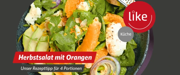 Die Hälfte des Dressings darübergießen und den Salat mit Mandeln und Orangenschale bestreuen. Das restliches Dressing einfach dazu reichen.