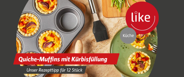 Den Backofen zuerst auf 180°C (Ober-/Unterhitze) vorheizen. Die Mulden des Muffinblechs mit etwas Butter einfetten. Dann den Mürbeteig zwischen zwei Frischhaltefolien 3mm dünn ausrollen und mit einem runden Ausstecher (ca. 11 cm Durchmesser) 12 Kreise ausstechen. Vorsichtig die Muffinblechmulden damit auskleiden und die Teigränder mit einer Messerspitze gleichmäßig ca. 5 mm eindrücken, sodass ein wellenförmiger Rand entsteht. Im Anschluss die Böden mit einer Gabel einstechen und im Backofen ca. 10 Min. vorbacken, dann die vorbereitete Füllung in die Teigmulden geben, mit den Zwiebelspalten belegen und weitere 12-15 Min. im Backofen backen.