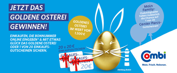 Mit Eingabe der Daten auf den Landingpages erhält jeder Teilnehmer die Chance auf folgende Gewinne: 1x1 goldenes Ei im Wert von 1.500 € oder je 20 x 1 20 EUR Einkaufsgutschein für Combi oder famila Nordwest. Moin Card Inhaber, die im Moin Family Club registriert sind, können 1 von 20 Center Parks Gutscheine* gewinnen. Moin Card Inhaber haben die doppelte Gewinnchance. Für die zusätzlichen Moin Card Vorteile muss in der Eingabemaske die Moin Card Nummer hinterlegt werden.