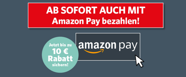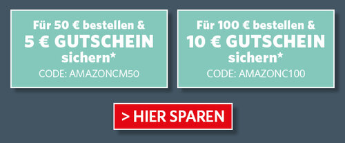 *Gültig bis einschließlich dem 23.04.2023, ausschließlich für Bezahlvorgänge mit Amazon Pay. Für den nächsten Einkauf. Geben Sie den Code im Bestellprozess ein um sich für den Gutschein zu registrieren. Sie erhalten Ihren Gutschein für den nächsten Einkauf 14 Tage nach Lieferung und Ablauf des Widerspruchsrechtes per E-Mail. Der Mindestbestellwert beträgt beim 5 € Gutschein 50 € / beim 10 € Gutschein 100 €. Nicht kombinierbar mit anderen Gutscheinen.