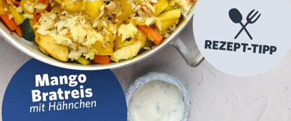 Zwiebel im erhitzten Öl anschwitzen. Fleisch zugeben, rundherum anbraten. Gemüse, 1 TL Salz und Gewürze untermischen, ca. 5 Min. garen. Reis und Mango zugeben, ca. 3 Min. weiterbraten. Mit Cashewkernen bestreuen. Joghurtsauce dazuservieren.