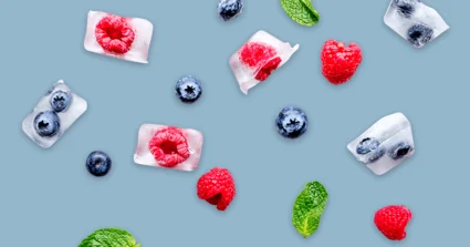 Friere in Eiswürfel für bunte Cocktails oder erfrischende Limonaden einfach frische Früchte oder Kräuter ein. So bekommen Himbeeren und kleine Minzblättchen einen echt coolen Auftritt und sorgen für ansehnliche Erfrischung.