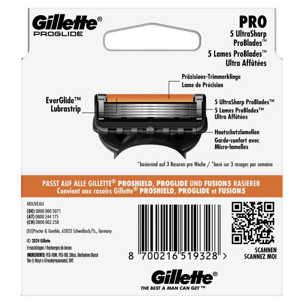 Die Gillette ProGlide Rasierer Ersatzklingen für Männer bieten die ikonische Rasurpräzision von Gillette mit Komfort und Stil. Dieser Rasierer für Männer hat einen größeren Gleitstreifen* für mehr Komfort und besseres Gleiten. Genieße extra Klingenstabilisation, die für einen optimalen Abstand der Klingen und besseren Schutz der Haut sorgt. Die Präzisionstrimmer-Klinge auf der Rückseite eignet sich perfekt zum Stylen von Gesichtshaaren, vor allem an schwer zu erreichenden Stellen. Unsere ultra-scharfen Anti-Irritations-Rasierklingen sorgen für eine sanfte und glatte Rasur und passen auf alle Gillette 5-Klingen-Rasierergriffe (außer GilletteLabs). ProGlide-Ersatzklingen reichen für bis zu 1 Monat Rasur.