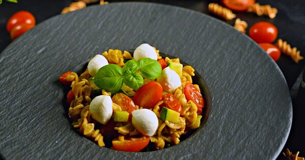 Nudeln mit Salzwasser bedeckt in der Pfanne kochen. Gemüse schnibbeln und zu den gekochten Nudeln hinzugeben. Mit Gewürzen abschmecken. Im letzten Schritt Pesto plus Mini Mozzarella untermischen und mit Basilikum garniert servieren.