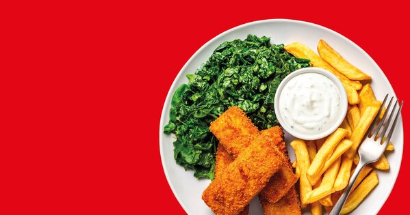 Zum Anrichten den Spinat auf 4 Tellern verteilen, die Fischstäbchen daneben legen und mit den knusprigen Pommes ergänzen.