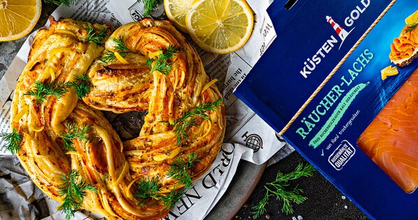 Erst einmal bereiten wir ein Backblech mit Backpapier vor und rollen den Blätterteig darauf aus. Anschließend löffeln wir die Ricotta, vermischt mit Dill und Sahne drauf und verteilen das Ganze gleichmäßig auf dem Teig. Als Nächstes folgt der Räucherlachs, bevor wir den Teig dann von der langen Seite aus aufrollen, längs durchschneiden, zum Zopf verdrehen und als Kreis ausformen. Bloß noch eine halbe Stunde bei 180 °C (Umluft) backen und fertig ist der Lachszopf.