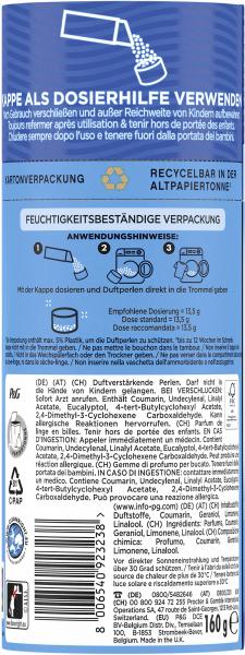 Duftverstärkende Perlen. Darf nicht in die Hände von Kindern gelangen. Bei Verschlucken: Sofort Arzt anrufen. Enthält Coumarin, Undecylenal, Linalyl Acetate, Eucalyptol, 4-tert-Butylcyclohexyl Acetate, 2,4-Dimemthyl-3-Cyclohexene Carboxaldehyde. Kann allergische Reaktionen hervorrufen. Vor direkter Sonneneinstrahlung und Temperaturen über 30 Grad schützen. Nicht in das Weichspülerfach oder in den Trockner geben.