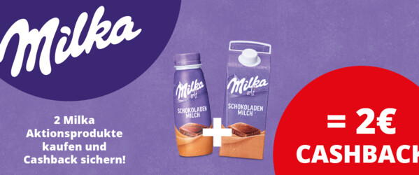 Kaufe 2 Milka Schokoladenmilchprodukte deiner Wahl, lade den Kaufbeleg auf https://milka.schokomilch-cashback.de/ hoch, und erhalte 2 Euro Cashback.