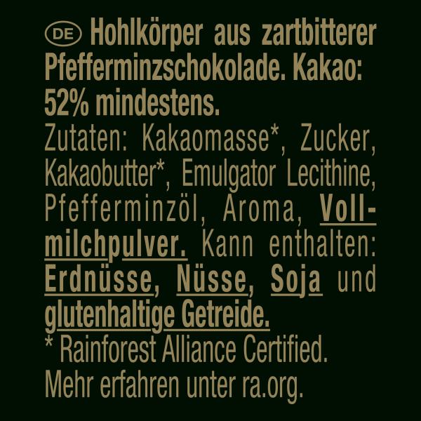 Hohlkörper aus zartbitterer Pfefferminzschokolade. Kakao: 52% mindestens.