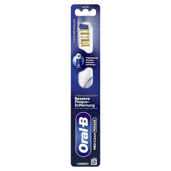 Eine überlegene Reinigung* mit der ORAL-B PRO-CLEAN PULSAR Zahnbürste. Diese batteriebetriebene Zahnbürste wurde mit Präzision entworfen und nutzt eine 5-Zonen-Plaque-Entfernung, einschließlich vibrierender Borsten, PowerTip Borsten einem Polierpad und flexiblen Seiten, die sich an die Kontur von Zähnen und Zahnfleisch anpassen. Für ein strahlend saubereres Lächeln. Kümmere dich um deine Mundgesundheit mit ORAL-B, der #1 Zahnbürstenmarke**, die von ZahnärztInnen weltweit am häufigsten empfohlen wird.