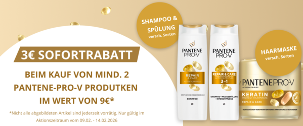 Jetzt 3€ Sofortrabatt beim Kauf von mindestends 2 Pantene Pro-V Produkten im Wert von 9 € sichern!