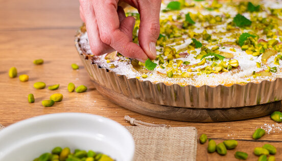 Wenn der Kuchen fertig gebacken ist, aus dem Ofen nehmen, auskühlen lassen und aus der Form nehmen. Mit gehackten Pistazien und Zitronenmelisse bestreuen, mit