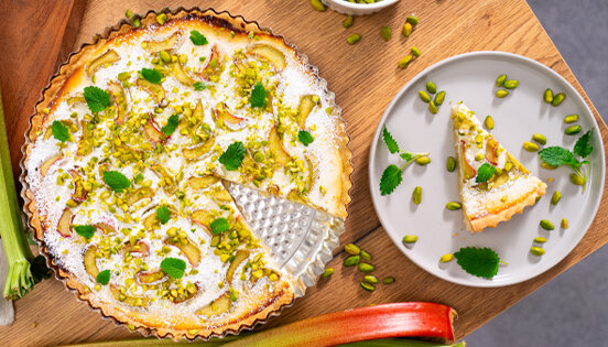 und der Rand zur Hälfte. Mit einer Gabel den Boden einstechen und ca. 10 Minuten auf mittlerer Schiene vorbacken. Anschließend die Backform aus dem Ofen nehmen, die Vanillecreme einfüllen und gleichmäßig auf dem Teigboden verteilen. Die Rhabarberstücke in Herzform darauflegen und den Kuchen für weitere ca. 20–30 Minuten backen.