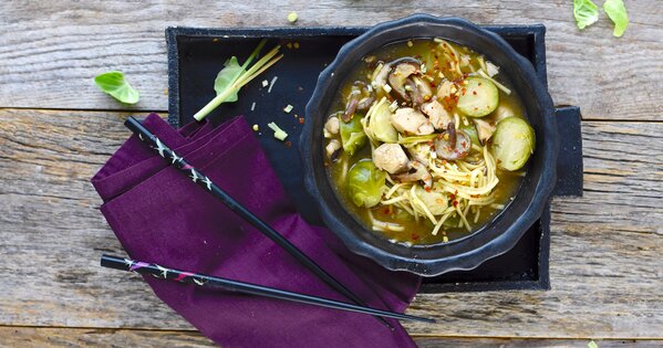 Knoblauch und Zwiebel im erhitzten Öl anbraten. Pilze, Ingwer, Zitronengras und Rosenkohl und Pilze zugeben, einige Min. mitbraten. Mit Brühe ablöschen. Fleisch zugeben, Suppe ca. 20 Min. köcheln lassen. Fisch- und Sojasauce zugeben. Saft der Limette auspressen, je nach Geschmack zugeben. Nudeln zugeben, in der Suppe ziehen lassen und servieren.