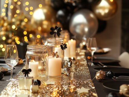 - Nutze goldene oder silberne Tischläufer, Konfetti und Kerzenhalter, um eine festliche Atmosphäre zu schaffen.