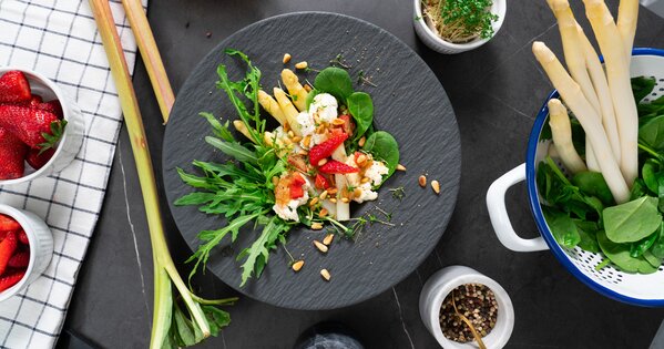 Abschließend Rucola und Spinatblätter mit dem weißen Spargel auf 4 Tellern anrichten. Je 3 Ziegenkäsetaler darauf legen, mit Rhabarber-Vinaigrette verfeinern und mit den