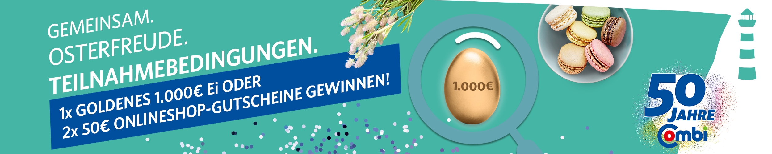 Am 04.04.2021 veröffentlicht Combi unter https://www.facebook.com/Combi ein Gewinnspiel zur Verlosung von 1x1 goldenes 1.000€ Ei und 2x1 50€ Onlineshop-Gutscheine für combi.de. Teilnahmeschluss ist der 11.04.2021 (23:59). Die Teilnahme erfolgt durch eine Gefällt-Mir Angabe der Combi Facebook-Seite, sowie einen Beitragskommentar unter dem zur Aktion gehörenden Post. Im Kommentar sollen die Teilnehmer die Anzahl der in den Posts versteckten Ostereier nennen. (In den Facebookposts im Zeitraum vom 21.03.2021 bis 04.04.2021 wurden Ostereier auf der Postgrafik versteckt) Durch das Veröffentlichen eines Kommentars unter dem entsprechenden Posting von Combi akzeptiert der Teilnehmer diese Teilnahmebedingungen.