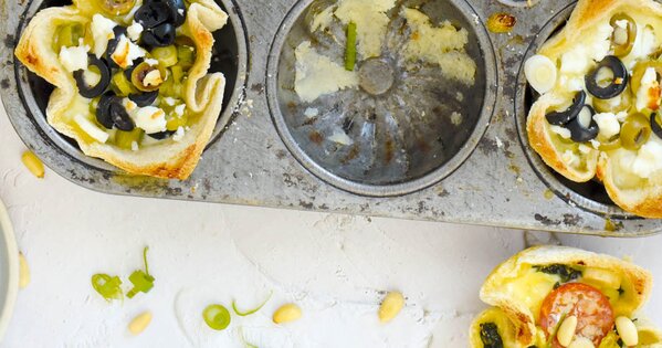 Spinat auftauen, Flüssigkeit ausdrücken. Frühlingszwiebeln waschen, putzen, in Ringe schneiden. Tomaten waschen, halbieren. Oliven in Ringe schneiden. Feta grob zerkrümeln. Toast entrinden, per Nudelholz flach walzen. Gebutterte Muffinmulden damit auskleiden.