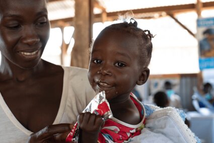 Das einjährige Mädchen aus dem Südsudan wird in einem UNICEF-Ernährungszentrum behandelt. Ihre Mutter brachte sie dorthin, als sie bemerkte, dass die Tochter immer schwächer wurde. Jenty schwebte in Lebensgefahr. Mit hochwirksamer Erdnusspaste kam das Mädchen langsam wieder zu Kräften.