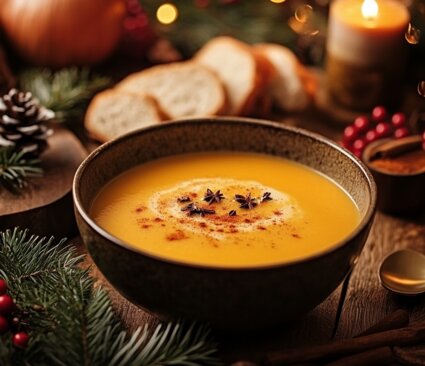 Mit einer cremigen Konsistenz und einer leichten Note von Zimt und Muskat zaubern Sie mit einer Kürbiscremesuppe eine wärmende Vorspeise, die ideal zu den festlichen Aromen passt.