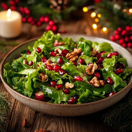 Ein knackiger Salat aus Feldsalat, Granatapfelkernen und gerösteten Walnüssen bietet eine leichte, aber festliche Alternative.