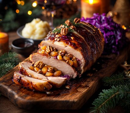 Ein saftiger Braten, gefüllt mit Trockenfrüchten und Nüssen, ist ein zeitloser Klassiker. Dazu passen perfekt Rotkohl und Kartoffelknödel.
