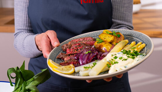 Weißer Spargel mit Entrecôte und Bärlauch-Zitronencreme