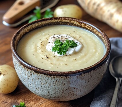 - Pastinaken, Kartoffeln und Zwiebel schälen und würfeln.