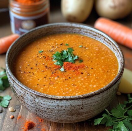 - Öl in einem Topf erhitzen, die Zwiebel glasig anbraten, dann Karotten, Kartoffeln und Tomatenmark hinzufügen und kurz mitrösten.