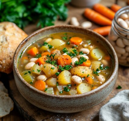 - Alles zusammen mit den Bohnen in der Brühe ca. 30 Minuten köcheln lassen.