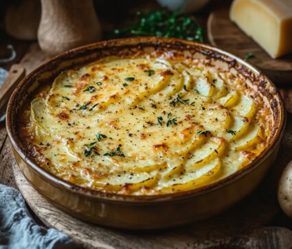 - Kartoffeln in dünne Scheiben schneiden und in eine Auflaufform schichten.