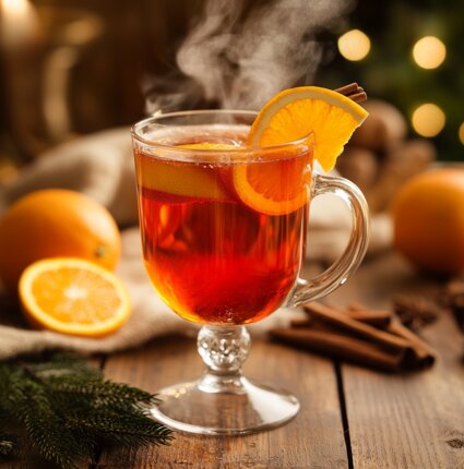 - Mit einer Orangenscheibe und einer Zimtstange garnieren.